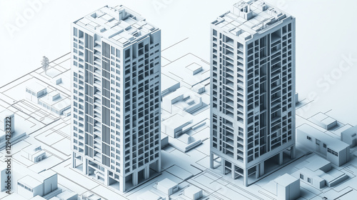 A photorealistic 3D architectural model of two high-rise buildings in an isometric perspective, displaying intricate facade designs and concrete structures in varying shades of gray