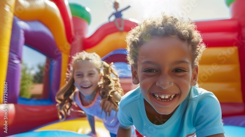 a photorealistic image of children jumping on an inflatable bouncy castle