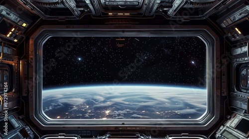 a photorealistic rectangular window in a spaceship, looking out into black, blank space
