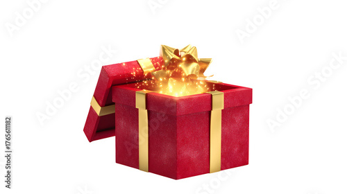 A photorealistic red gift box, slightly open, with a golden light glowing from within, topped with a simple gold ribbon bow. Magical and mysterious, studio lighting, isolated on white background.