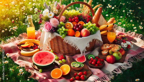A picnic on a green meadow with a basket of fruits and flowers
