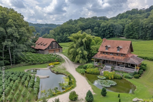 countryside, farmhouse, vinery, duck pond, greenery, rural, estate, nature, landscape, outdoors, house, garden, lawn, hill, tree, water, sky, cloud, rustic, charming, serene, idylli, beautiful, peaceful, tranquil, fresh, green, natural, vine, grape, foliage, wood, timber, stone, brick, grass, field, farm, agriculture, summer, day, sunshine, bright, airy, open, roomy