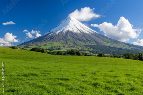A picturesque dormant volcano with a lush green valley at its base