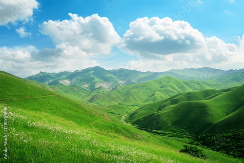 A picturesque landscape featuring rolling green hills under a bright blue sky with fluffy white clouds. The scene captures the beauty of nature with lush greenery and distant mountains.