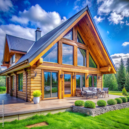 A picturesque log house set against a stunning natural backdrop, showcasing rustic architecture harmonizing with the surrounding landscape.