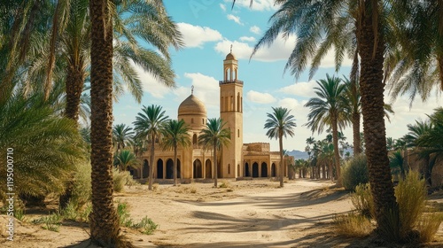 A picturesque mosque in the heart of a desert oasis, framed by palm trees, clean layout for copy space