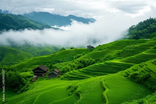 A picturesque mountain village nestled amidst lush green rice terraces, shrouded in a mystical layer of fog, offers a serene and breathtaking landscape. The image symbolizes harmony between nature and