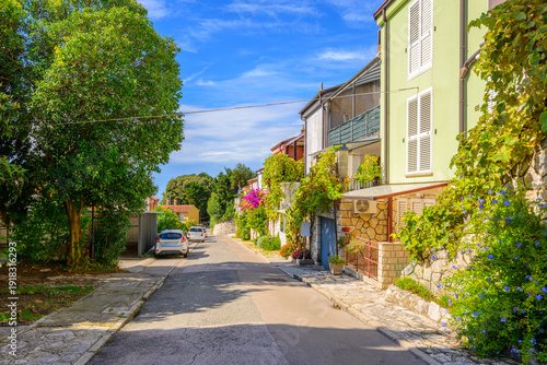 A picturesque residential street with colorful flowers and stone walls in the coastal town of Piran, Slovenia, on the Istrian peninsula.