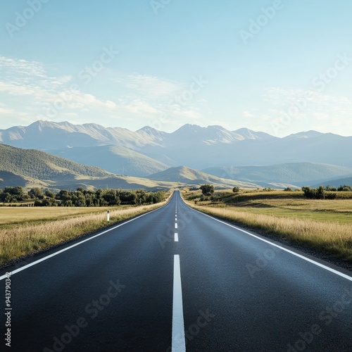 A picturesque road stretches through an open landscape, framed by majestic mountains under a clear blue sky.