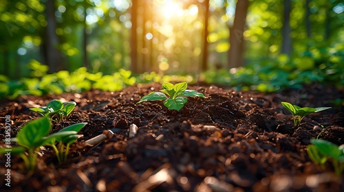 A picturesque view of a compost bin, wide-angle capturing the rich, dark soil and garden waste within. The sunlight enhances the textures and colors of the compost and surrounding plants,