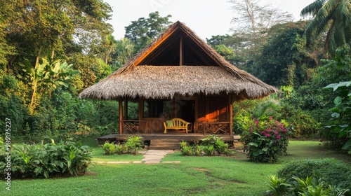 A picturesque view of a garden house with wooden beams and a thatched roof, surrounded by tropical foliage, emphasizing the beauty of rural architecture.