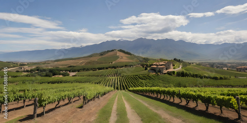 A picturesque vineyard with rows of grapevines and a mountain backdrop