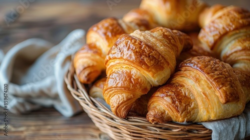 A picturesque wicker basket filled with freshly baked croissants, each perfectly golden-brown and flaky. The scene evokes the cozy charm of a classic French bakery.
