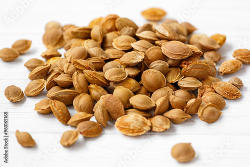 A pile of apricot pits on a light background. View from above. Vitamin B 17. Healthy food.