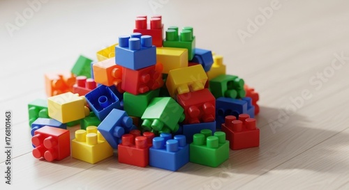 block, toy, play, pile, stack, colourful, bright, primary, colours, blue, red, yellow, green, orange, construction, building, connector, plastic, children, fun, education, creative, imagination, hobby, activity, childhood, children, preschool, learning, assemble, design, structure, three-dimensional, surface, texture, light, shadow, closeup, macro, wooden, floor, hardwood, background, scattered, overlap, random, perspective, side, focused