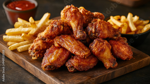 A pile of fried chicken wings on a wooden board, accompanied by side dishes such as fries and ketchup