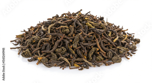 A pile of loose leaf black tea, dark brown and green, isolated on a white background.