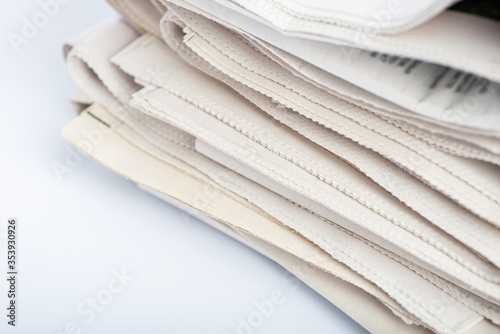 A pile of newspapers on a light background, top view. Folded and stacked newspapers
