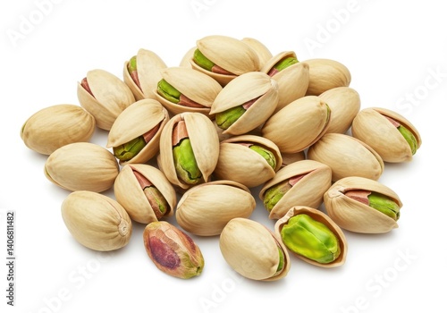 A pile of pistachios in their shells with some visible green nuts on a white background surface