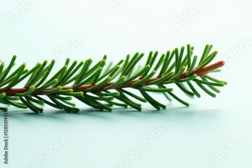 A pine tree branch stretched out horizontally across a light-colored surface with tiny needles on it, pine branch, evergreen, white background