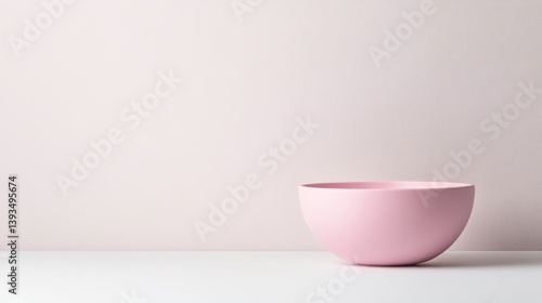 A pink ceramic bowl placed on a white surface against a soft pastel pink wall, minimalist composition with clean lines, and serene and calm atmosphere.