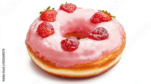 A pink frosted donut topped with fresh strawberries, showcasing a delightful and tempting dessert perfect for any sweet tooth.