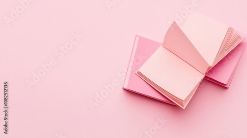 A pink notebook with open pages on a matching pink background, suggesting creativity and organization.