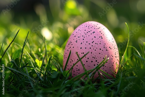 A pink speckled Easter egg resting on green grass, illuminated by soft sunlight, evoking a peaceful spring ambiance.