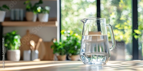 counter, glasses, jug, kitchen, pitcher, plant, table, water, window, drink, wine, alcohol, beverage, bottle, champaign, celebration, liquid, decoration, flower, wedding, ice, fresh, green, cocktail, eatery, food, party, holiday, transparent, mint