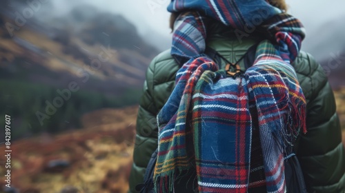 A plaid scarf wrapped around a hiker's neck, providing warmth in the mountains