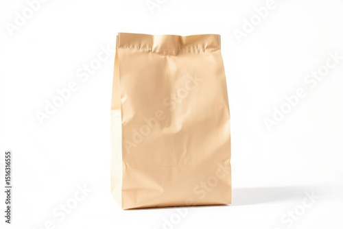 A plain tancolored paper bag stands upright against a white background casting a slight shadow