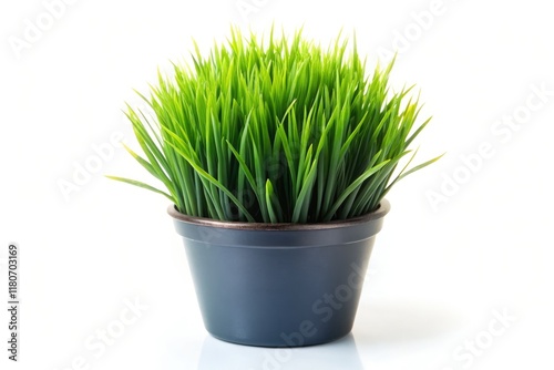 A plastic pot of artificial green grass, subtly illuminated, stands alone against a stark white background.