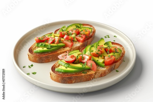 A plate of avocado and tomatoes sandwiches on white background