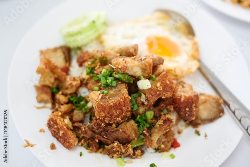 A plate of crispy pork belly stir fried with holy basil (kra pao moo grob), white rice and a fried egg at a street food stall at Soi 20 - Silom, Bangkok, Thailand