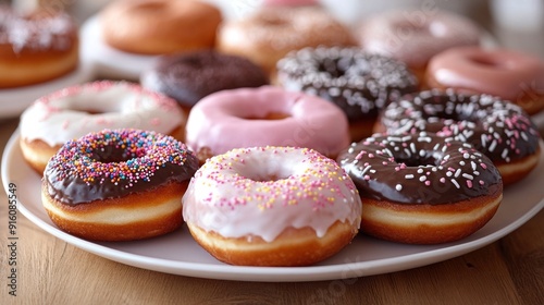 donut, food, dessert, sweet, glazed, chocolate, sprinkle, pink, white, brown, plate, table, bakery, pastry, sugary, treat, delicious, tasty, sugar, round, fried, dough, cake, confectionery, snack, breakfast, morning, afternoon, fresh, yum, sweetness, deliciously, indulgence, sweet tooth, appetising, colourful