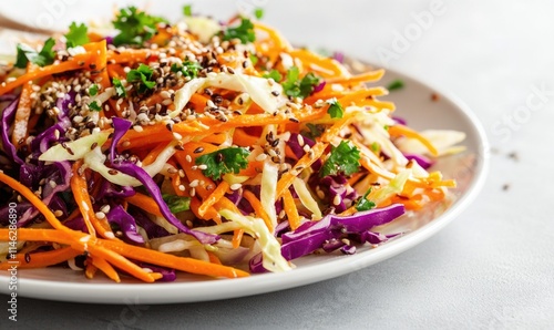plate, food, carrot, sesame, seed, orange, top, salad, diet, healthy, fresh, vegetable, dish, meal, vegetarian, cookery, asian, green, lunch, background, organic, sauce, white, dinner, red, ingredient, traditional, cooking, tasty, delicious, chinese, epicure, closeup, vegan, nourishment, wooden, spicey, eat, raw, bowl, noodle, thai, eatery, asia, rice, cabbage, table, shredded, horizontal