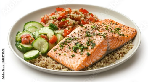 A plate of fresh salmon with a side of quinoa and vegetables on a white background, with space for text.