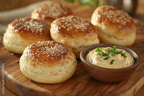 sesame, bun, bread, baked, fresh, food, pastry, snack, gold, creamy, dip, herb, delicious, cookery, epicure, breakfast, lunch, dinner, side dish, homemade, rustic, wooden, plate, serving, tasty, culinary, soft, fluffy, texture, savoury, meal, party food, catering, gourmet food, traditional, organic, healthy, vegetarian, comfort food, cooking, receipe, kitchen, ingredient, culinary arts, food photography
