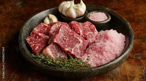 A plate of marbled beef slices, pink sea salt, garlic, and fresh herbs, showcasing an appetizing collection of ingredients for a gourmet meal.