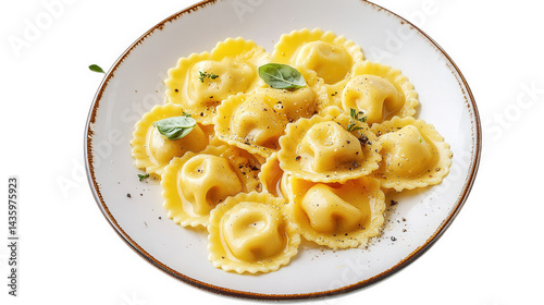 a plate of ravioli garnished with fresh basil leaves. showcasing a delicious pasta dish the ravioli. filled and delicately shaped. are arranged neatly. inviting a delightful dining experience the pres