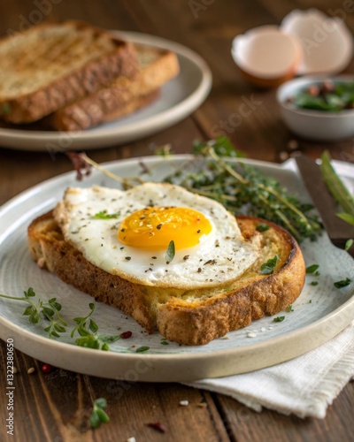 A plate with a sunny-side-up egg on slices of toasted bread, garnished with herbs.