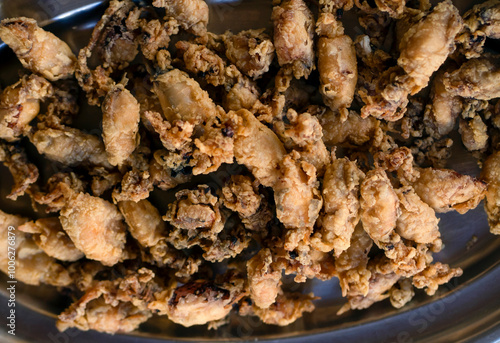 A plate with fried small delicious cuttlefish, grilled seafood closeup.