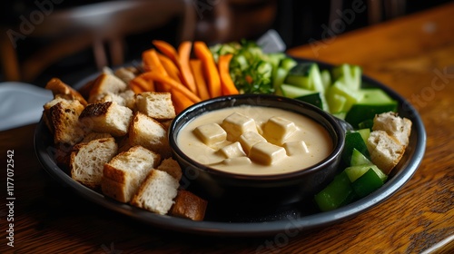 A platter of cheese fondue with bread cubes and vegeterian