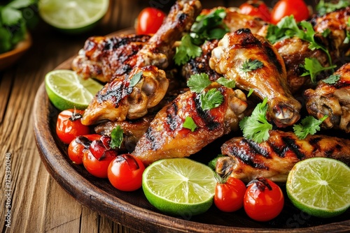 A platter of grilled chicken wings garnished with lime slices, cherry tomatoes, and fresh herbs, presented on a wooden table