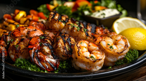 A platter of grilled shrimp and lobster tails, served with lemon wedges and a side of grilled vegetables.