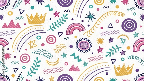 abstract, pattern, doodle, colourful, playful, whimsical, fun, vibrant, cheerful, happy, bright, graphic, design, background, texture, white, pink, purple, yellow, teal, blue, green, orange, red, gold, star, rainbow, crown, triangle, circle, wave, zag, zag, swirl, leaf, tree branch, geometric, festive, celebration, children, children, cute, simple, hand, drawn, art, illustration