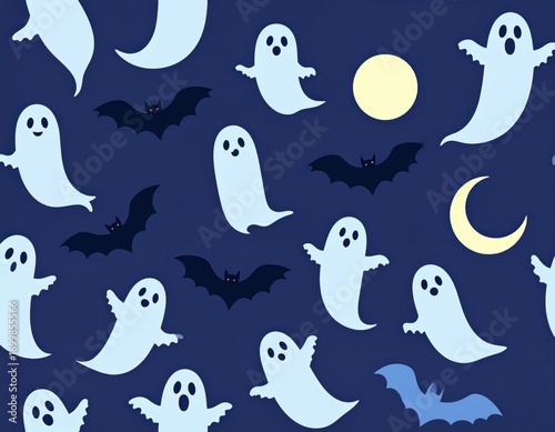 A playful and spooky seamless pattern featuring cartoon ghosts, bats, and moons on a dark blue background.