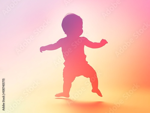 A playful baby silhouette with vibrant coral tones dancing on a peachy gradient backdrop ,