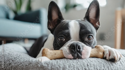 dog, boston, terrier, pet, chew, bone, cosy, bed, indoor, playful, animal, cute, companion, home, furry, black, white, expression, relaxation, happiness, canino, domestic, sitting, looking, attention, comfort, soft, adorable, care, lifestyle, lover, decor, living, room, furniture, behaviour, joyful, closeup, portrait, photo, owner, companionship, love, affection, snuggling, resting, happy, friends, moment