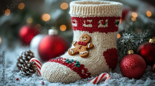 a playful Christmas sock cutout filled with festive items like ornaments, a gingerbread man, and candy canes, showcasing holiday spirit and creativity, perfect for a festive decoration.